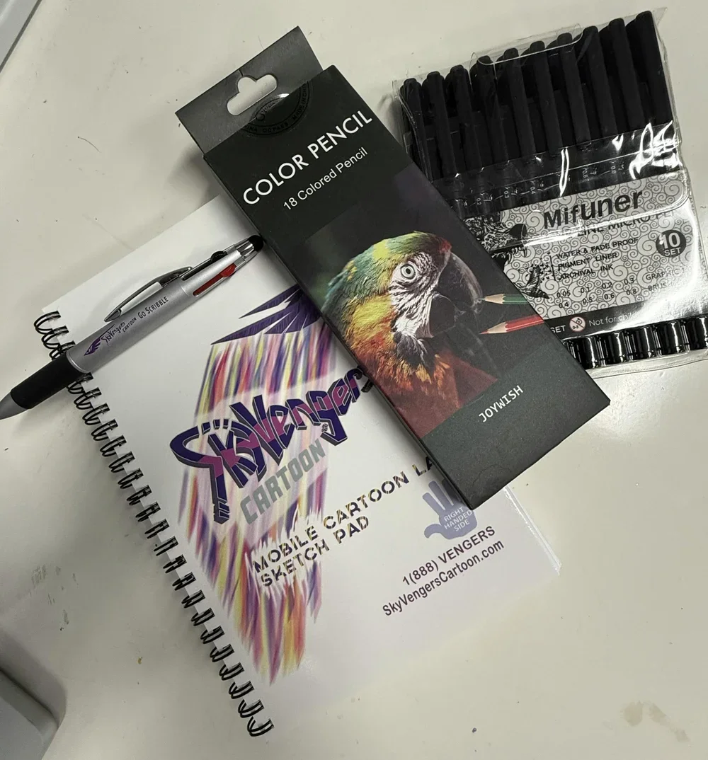 Students will receive a cartooning lab kit complete with sketchbook, colored pencils, pack of pens, and a 4-color pen/stylus (see other picture for example kit).